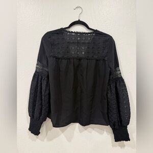 This elegant black blouse features a relaxed fit with smocked detailing, offering a chic and comfortable style. The long sleeves add a touch of sophistication, making it perfect for any occasion.