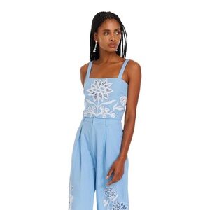 Adorned with beautiful embroidery; the Tyra Crop Top exudes vacation vibes. Cut with a boxy shape and square neckline, the shoulder straps have an adjustable hidden button at the back. Features a center back zipper closure and fully lined. No stretch. Pairs perfectly with the matching Hutton Pants.