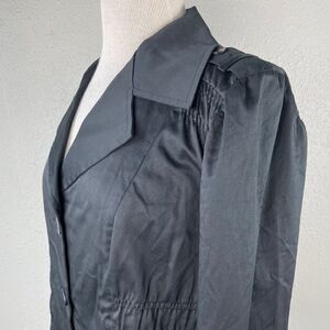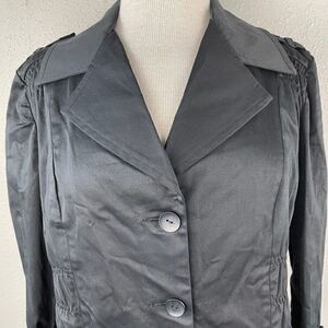 Super stylish light black button down jacket top featuring a slightly cropped design and fitted at the waist. It measures 21 inches armpit to armpit and 22 inches in length.