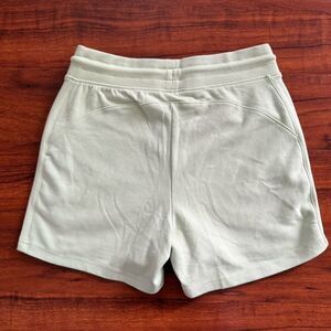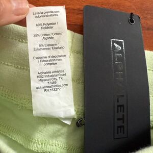 This is a pair of NWT Alphalete Women's Essential Core Athletic Sweat Shorts in Spring Green. They feature a solid pattern, drawstring closure, fleece fabric type, and a 3.5-inch inseam. Made of polyester, spandex, and cotton, they provide comfort and have zipped pockets, an adjustable waist, and the Alphalete logo. Suitable for activewear and casual occasions, they are machine washable and ideal for various activities like gym training, loungewear, and running.