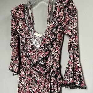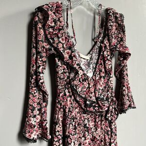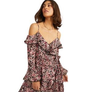 NWT Altar’d State Greta Ruffle Off-shoulder Mini Dress Black Pink Floral Small