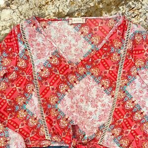 NEW WITH TAGS - RETAIL $60 - SIZE MEDIUM - This Altar’d State Red Print Crop Top is precious! Festival season here we come! Pair this cute crop top with some frayed jean shorts and you are ready to dance the night away. Color is salmon and bright red with creme and light blue Loose fit Long sleeve 100% polyester Machine wash cold, tumble dry low Made in U.S.A.