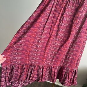 A beautiful intricate beaded sequined neckline, and a ruffled hem. The dress is a mix of pink and red hues with a textured geometric Aztec- like pattern.