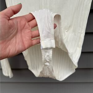 Altar’d State brand, cream or ivory color called "cloud" by Altar'd State, ribbed long sleeve bodysuit, deep v-neck, 2 snaps for easy on and off, comfortable, soft, stretchy, fitted material is 95% rayon and 5% spandex, women's size medium, brand new with tags, NWT condition