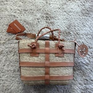 Altuzarra's mini Watermill tote bag is expertly crafted of palm straw, with a braided leather handle and strap, offering a touch of rustic charm to this refined accessory.