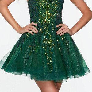 Seize the moment and make a statement by donning this Alyce Paris 3111 creation, ensuring you stand out and capture all the attention. The dazzling sleeveless dress is amazingly designed with intricate sequins and glitter embellishment throughout the fit and flare bodice. It presents a scoop neckline, thin halter-style straps, and an open back with a crisscrossed lace-up tie and zipper closure for an ideal fit. The skirt reveals an A-line silhouette that flows in a short hemline with horsehair trim.