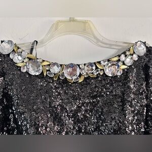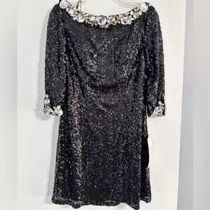 Jeweled scoop neckline short dress. Hand-sewn sequined fabric with large jeweled stones on 3/4-length sleeve and dramatic low-cut back.