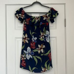 The ruffled shoulder and tropical flower print are fun and feminine with bright pops of summery color, while the deep navy background keeps the look grounded. Wear this dress to weekend brunch or even to a wedding or event, it is so easy to dress up or down that we consider this dress a must-have! Off the shoulder style. A double ruffle on the sleeves adds volume and texture to the sheath fit dress bringing an extra touch of lavish femininity into this floral piece.