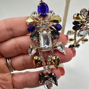 They are fairly lightweight for being 4" long. These have multiple acrylic rhinestones in gold tone, vibrant blue, gray and clear.