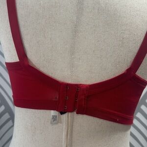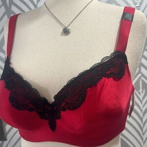 NWT Ambrielle lightly lined balconette red satin bra. Partial black lace. Full figure. Size 38DD. Band measures 29 inches clasp to clasp.