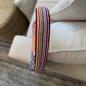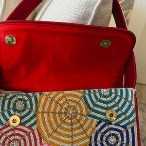 The NWT America and Beyond Under My Umbrella Shoulder Bag is a stylish and colorful accessory for women. The exterior features a beaded design with a multi-color umbrella pattern, perfect for adding a beachy touch to any outfit. The bag is lined with satin and has inner and outer pockets for organization. The snap closure and red beaded strap make it easy to carry. This shoulder bag is a fashionable and functional choice for anyone looking to make a statement with their handbag.