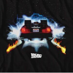 Brand new with tags. Front features the iconic DeLorean and Doc Brown’s famous quote: “Roads? Where we’re going, we don’t need roads.”