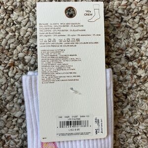 This product is a pair of NWT American Eagle '90s Crew Socks in a size one size, perfect for Valentine's Day gifting. The socks feature a white color with a heart pattern, making them a fun and stylish addition to any outfit. Made from a soft polyester blend with elastane for comfort, these mid-calf crew socks are machine washable and suitable for everyday wear. These socks are a great gift for any season.