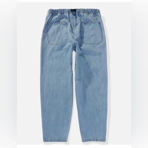 Elastic waist with belt, rigid cotton denim with no stretch. Medium wash.