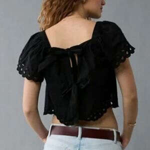 NWT American Eagle Black Cropped Eyelet embroidered tie back top Size Small