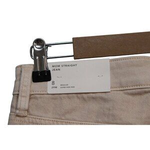 This is a new-with-tags pair of American Eagle high-rise mom jeans in a beige color, size 8 / 29. The jeans feature a solid pattern with a straight leg style, made of light wash cotton denim. They have a zip and button closure, and come with pockets. The design of these jeans gives off a retro, 90s, and preppy vibe, making them a stylish and versatile addition to any wardrobe.