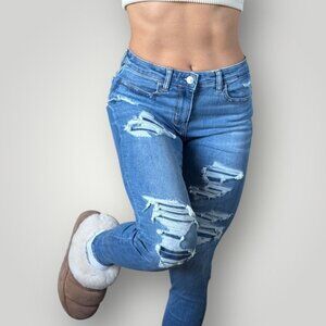 Trendy distressed skinny jeans in a medium blue wash. Features heavy front distressing and knee rips and classic zip fly with button closure. Made from soft, stretchy denim that hugs your curves for a flattering, comfortable fit. Perfect for casual wear, street style, or layering with oversized sweaters and crop tops. Retail price: $69.95