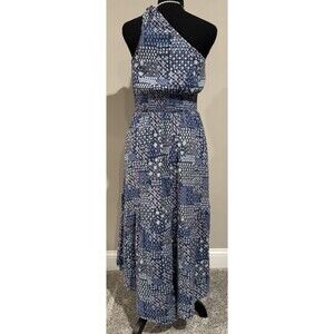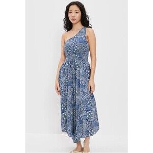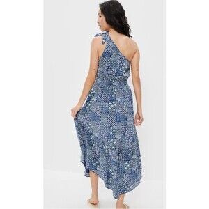This NWT American Eagle One Shoulder Maxi Dress in size small tall is a stylish and feminine choice for various occasions. The dress features a patchwork design with a sleeveless style and a one shoulder neckline, perfect for travel, parties, or casual outings. Made from a blend of viscose and cotton, the dress is lightweight and has a stretch waist for comfort. The blue color and bohemian theme make it a versatile option for summer, fall, and spring seasons. Easy to care for with machine washable instructions, this dress from American Eagle Outfitters is a must-have for any woman's wardrobe.
