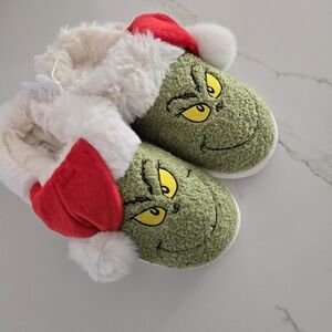Cozy slippers with Grinch design. Soft green fabric. Red and white Santa hat detail. Perfect for lounging.