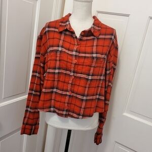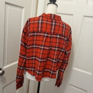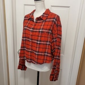 NWT American Eagle Red Plaid Cropped Button Up Flannel Size Large, comfy Ret.$44