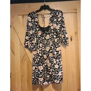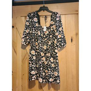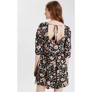 NWT American Eagle Size XS Floral Baby Doll Puff Sleeve Mini Dress Black Peach