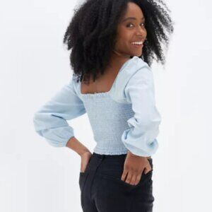 NWT American Eagle Smocked Long Sleeve Denim Cropped Blouse Medium Chambray Blue