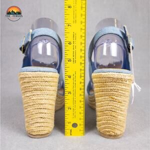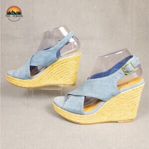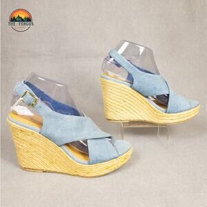 Step into summer style with these American Eagle wedge sandals. Crafted with a light blue denim upper in a stylish crisscross design, these sandals offer a relaxed and trendy look. The comfortable wedge heel features a natural espadrille trim, adding a touch of beachy flair. An adjustable ankle strap ensures a secure fit. Perfect for warm-weather days and casual outings. They are in excellent pre-owned condition.