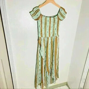 Description: Off-the-shoulder pullover style wrap dress. High-low hem. Light weight. Stripped pattern design. Smocked bodice. Unlined skirt.