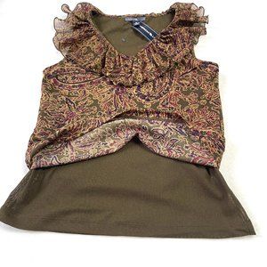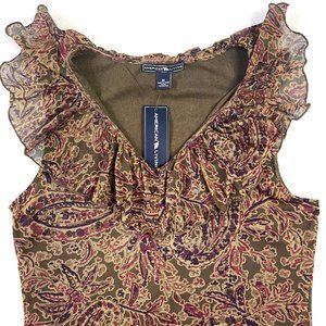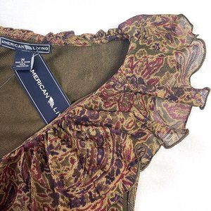 NWT Gorgeous print! American living Stretchy Mesh Ruffled V-neck Top size M. mesh outer, mesh lining Chest 19", length 25"