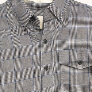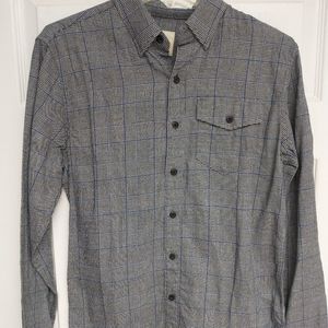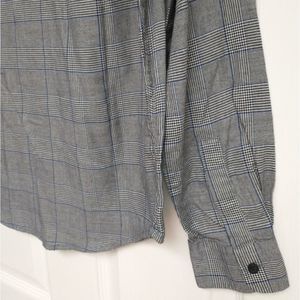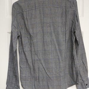 American Eagle button down shirt; gray with blue/black/white lines. Pocket with button on left side chest.