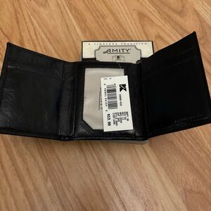 Elegant black leather wallet by Amity. Features a tri-fold design. Perfect for everyday use.