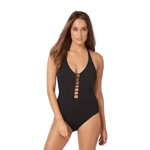 Opulent gold-tone hardware adorns the center column of this sultry halter one-piece swimsuit from Amoressa by Miraclesuit.