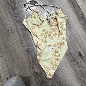 NWT Amuse Society Frances One Piece Swimsuit Tea Green Size Small. Has all over print, cheeky, deep scoop back