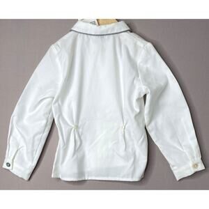 * Details: cotton-blend white dress shirt has a rounded collar with gray trim; wool-blend gray cuffed shorts have an elastic back-waistband; mother-of-pearl buttons