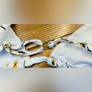 NWT Andie X Demi Moore Tropaz String Bikini Top in White Firecracker Print (White, Yellow, and Black), Unpadded with Minimal Coverage, Adjustable Spaghetti Straps, and Back Clasp, Size Large.