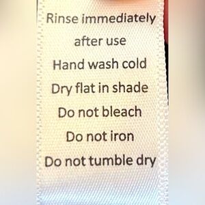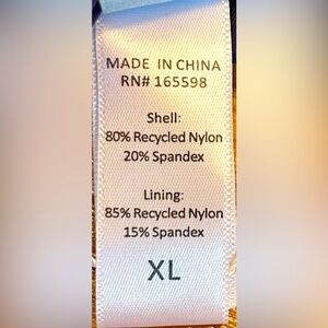 FABRIC: Shell: 80% Recycled Nylon and 20% Spandex.  Lining: 85% Recycled Nylon and 15% Spandex.  Hand wash.