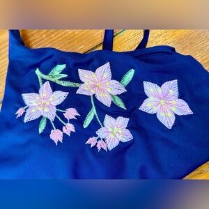 COLORS: Dark Blue with Pink, Green, and Yellow embroidered florals.
