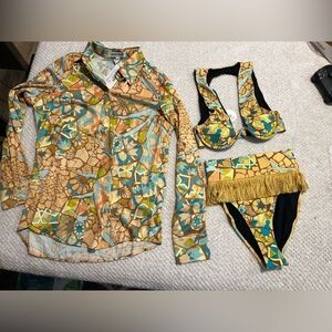 See matching button down in my closet. Last photos shows them together. Similar print and would go perfect as a beach coverup.