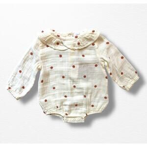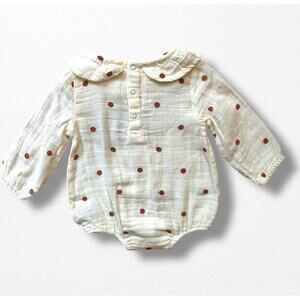 A ruffled collar and charming dot print define this organic-cotton bodysuit that's featured in a bubbly silhouette.