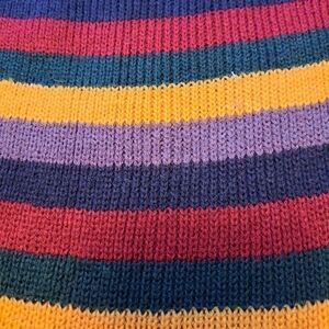 striped fall colors, 100% acrylic, multi colored fringe, scarf measures 8" x 31" hat measures 8" x 10.5"