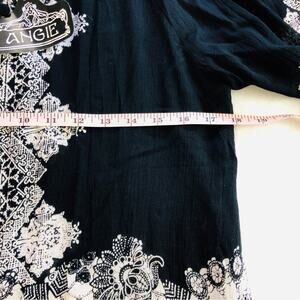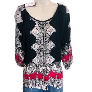 NWT Angie Black Red Boho Inspired Print Long Sleeve Top 3 button Scoop Neck Top
