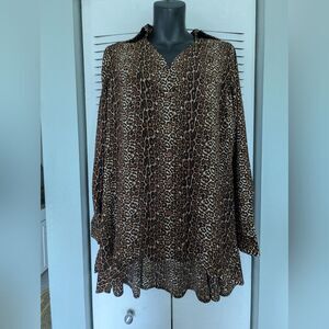 NWT Animal Print High Low Top L/S Small Collared Mobwife No Iron Brown Black Tan Oversized