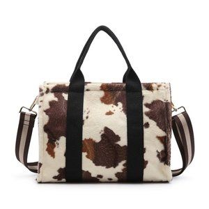 Brand New with Tags. Satchel-style handbag with cow brown print on furry fabric. Included is an adjustable/detachable guitar strap, in addition to the attached handles.