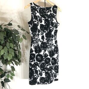 A brand new gorgeous silk-like dress with a black and white floral pattern on it! It’s hard to capture in the photos but the top part of the dress has a cowl neck line and folds/layers for a more flattering style. A zipper and hook for closure! The perfect work dress