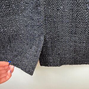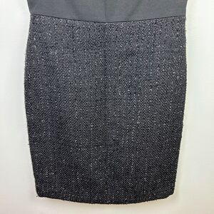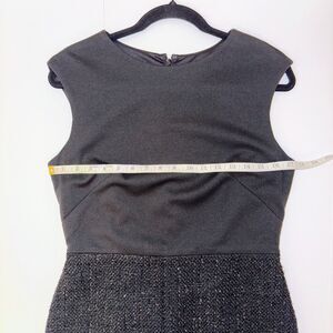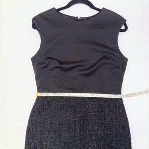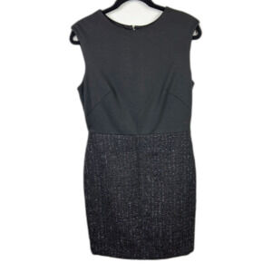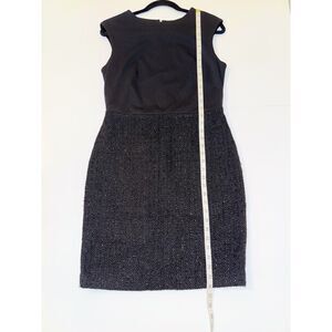 Brand new with tags Ann Taylor black sleeveless sheath dress with tweed metallic skirt. This classic little black dress is lined and features a flattering round neck, sleeveless yet almost cap sleeves, and a beautiful tweed skirt with shiny silver metallic thread allowing this to be both a festive party look and a career dress. Lined, back zip closure. NWT, women's petite size 6 P, measurements pictured.