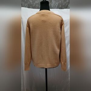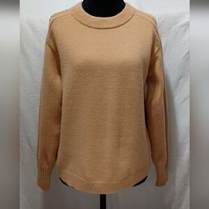 Classic and versatile, this neutral camel pullover features a ribbed neckline, cuffs, and hem for a clean finish. Subtle cable knit detail runs along the sleeves, adding a touch of texture to the minimalist design.