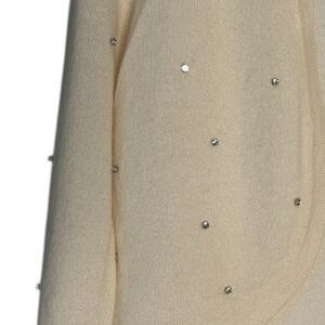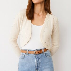 NWT Ann Taylor cardigan shrug in cream. Color is Pale Ivory. Open front and long sleeves. Scattered rhinestones throughout. 100% cashmere. Excellent new condition. Size S