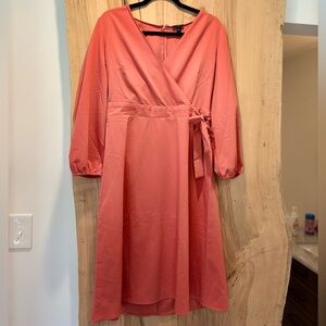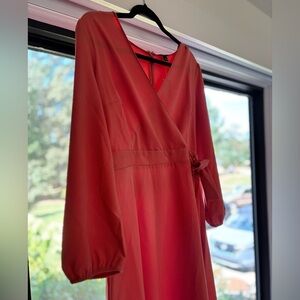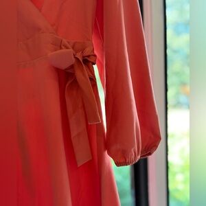 Chic coral wrap dress with long sleeves. Perfect for versatile styling.