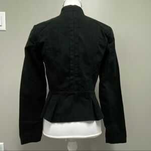 Casual black canvas jacket. Peplum shape with pleated detail at front. Zip closure. Brass buttons.