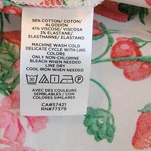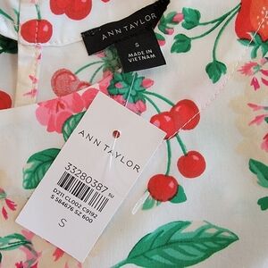 NWT Ann Taylor strawberry and cherry white peplum tie back top. Features white, pink, red and green and floral blossoms. Sleeveless, peplum waist, tie back at the neck. Perfect summer look.